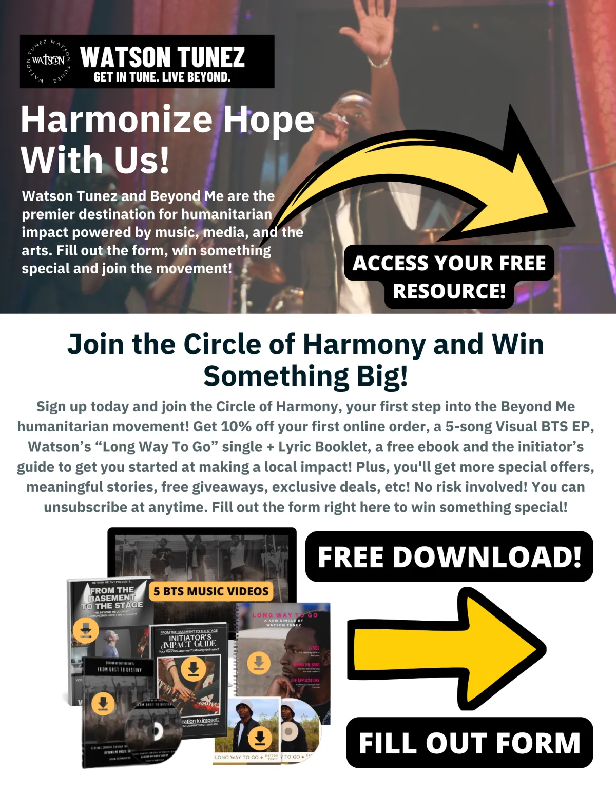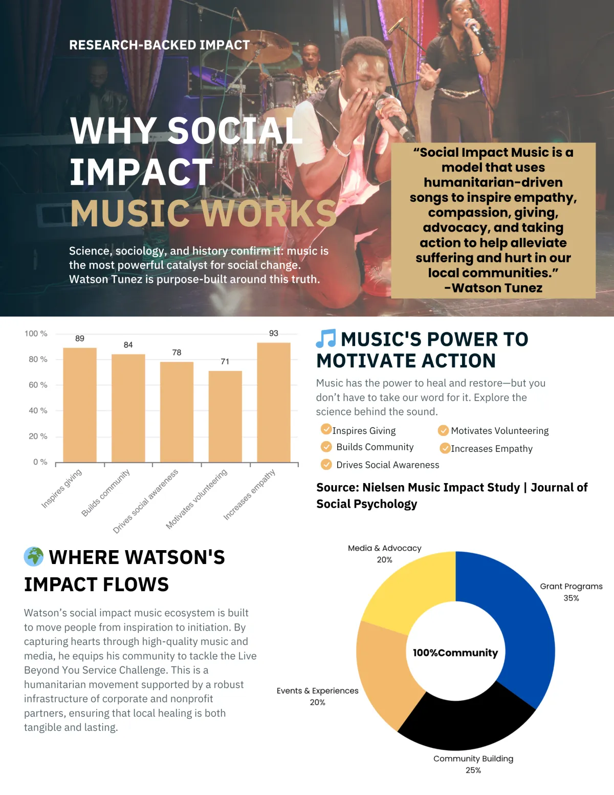 Watson is the visionary behind the Live Beyond You (LBY) Service Challenge, a humanitarian movement that leverages "social impact music" to bridge the gap between personal healing and community service. By turning fans into Initiators, Watson provides a three-step blueprint for local healing: participants form service groups, partner with a local charity, and document their impact via video at LiveBeyondYou.org. This process officially nominates their chosen charity for a grant of up to $5,000.